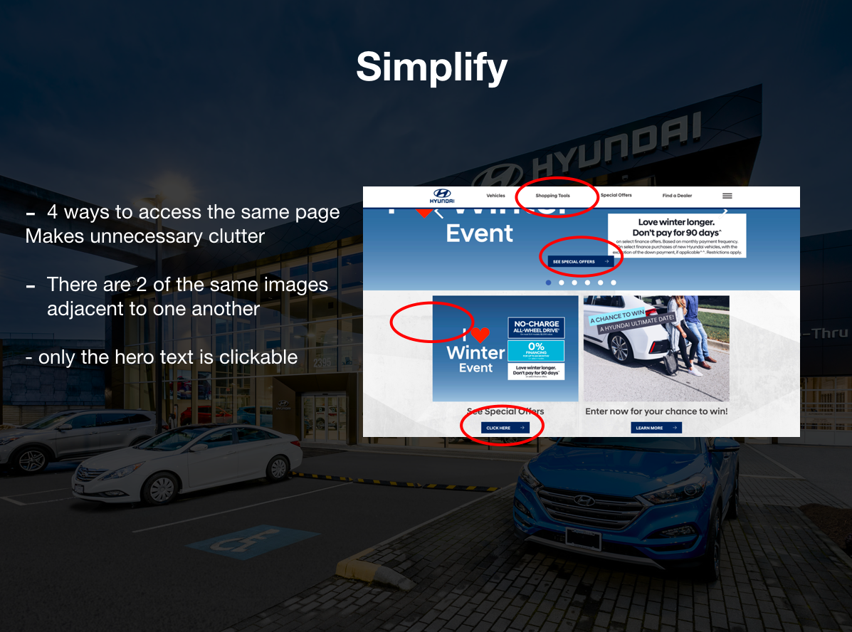 This project aims to gain insight into how users interact with various elements of the Hyundai Canada mobile and desktop website to improve the user experience of first-time car buyers, such that Hyundai becomes the first choice for car purchases among millennials. As such, the focus was broken down into three scenarios.
