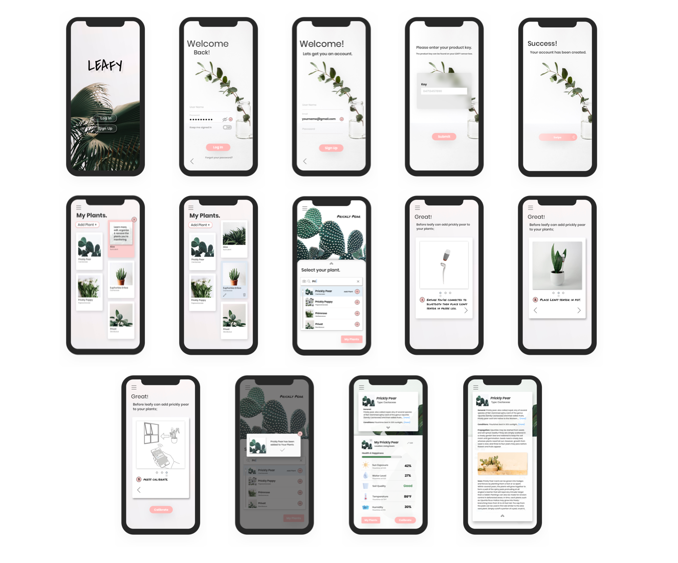 After user testing, changes were made to Leafy’s design based on the results, and a high-fidelity prototype was created. Some changes include decluttering the Plant Profile screen and adding a call to action to the Product Key Submission Confirmation screen.