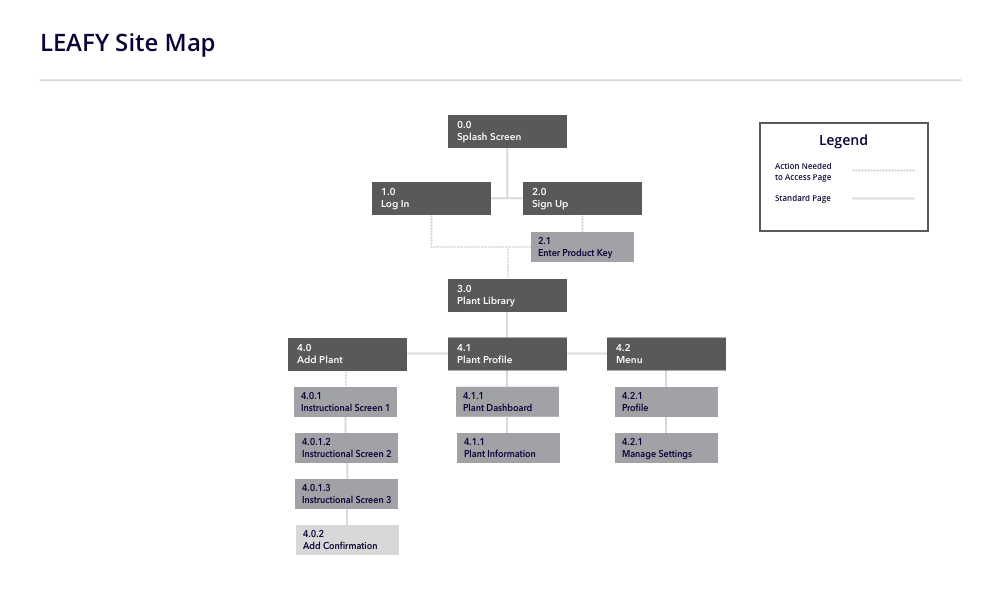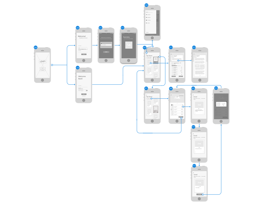 Next, a user flow was created. This was done to communicate and visualize the intended flow of the Leafy user through the process and steps necessary to utilize the app, ensuring no steps had been missed. Please refer to the site map when looking at screen numbers as the documents correlate for easy referencing.