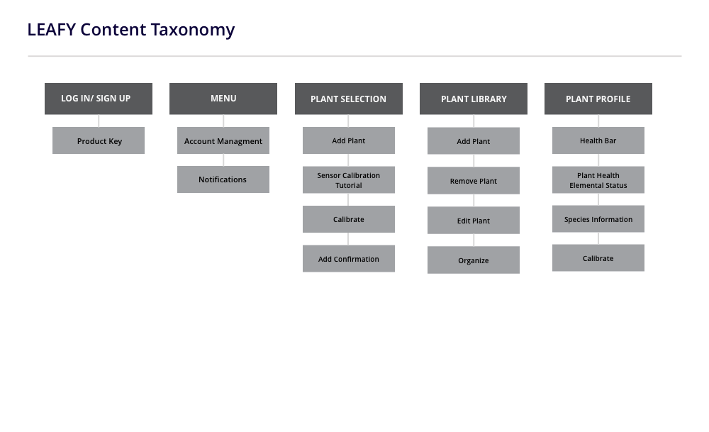 By analyzing Jessica’s plant care journey, features were narrowed down via card sorting. This revealed the necessary features required for Leafy to function. A content taxonomy map was then created, which gave meaning to the defined features, and a site map was created to organize the app's pages, information, and navigation.