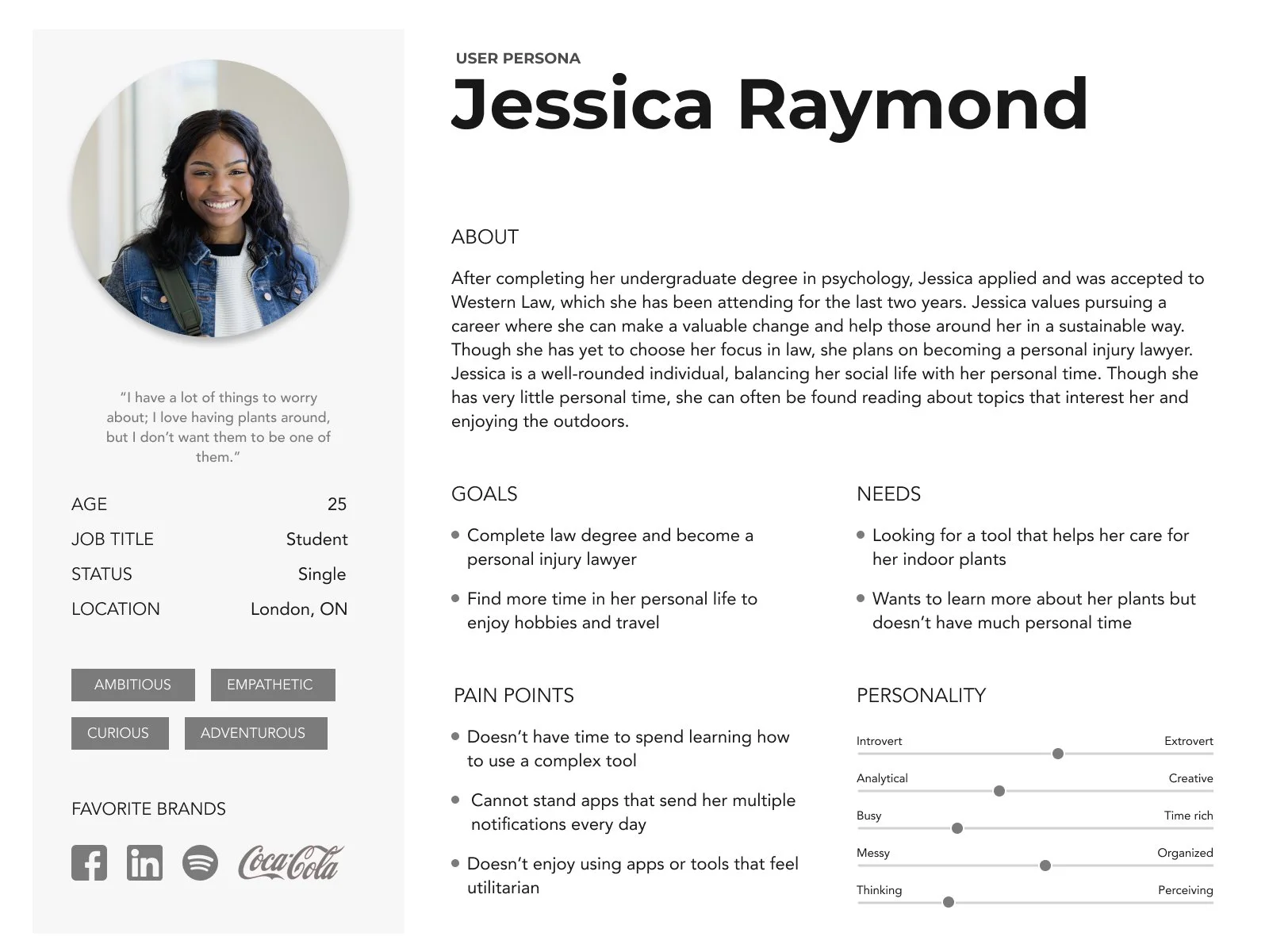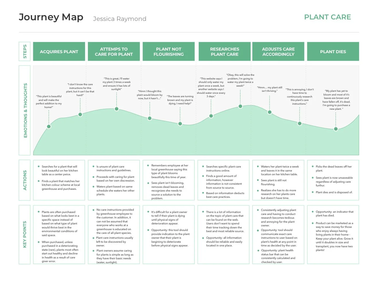Keeping Jessica in mind, we mapped her behavioural flow from purchasing a plant to caring for it and finally disposing of it. Understanding her decision-making flow within the plant-care experience allowed for more thorough brainstorming of the features and functionality required for Jessica to navigate the app and utilize the product successfully.