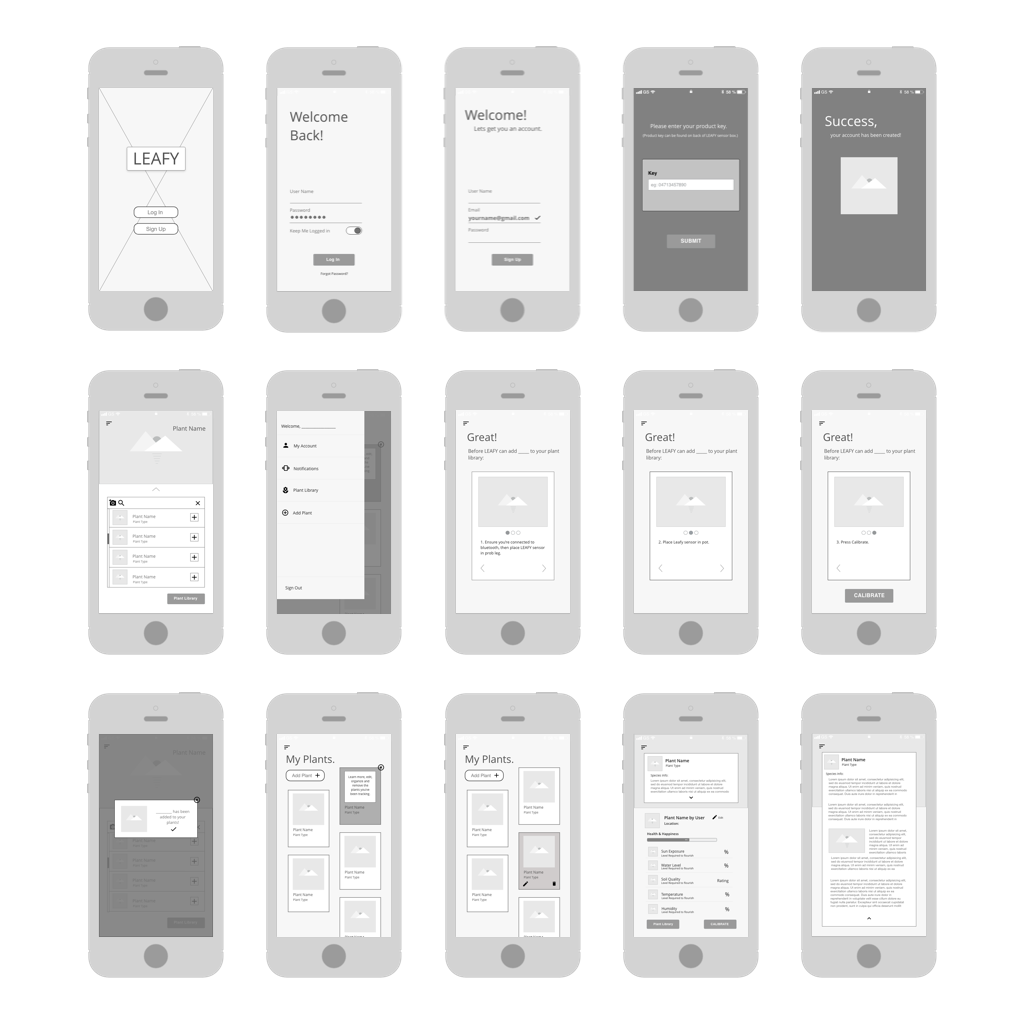 Ideation of the interactive app began by developing a flow in which the user would create and add their plants as individual profiles to a plant library. All information about individual plant species and current health status can be found and monitored in the plant library. This flow was developed while considering four key usability requirements created based on research conducted during the discovery phase.